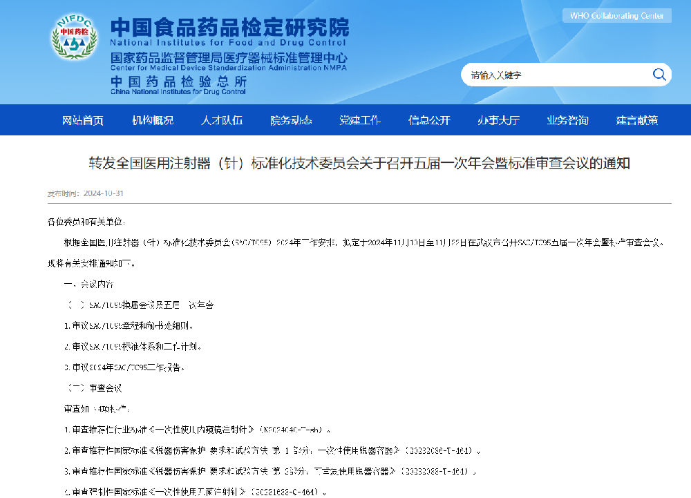 转发全国医用注射器(针)标准化技术委员会关于召开五届一次年会暨标准审查会议的通知