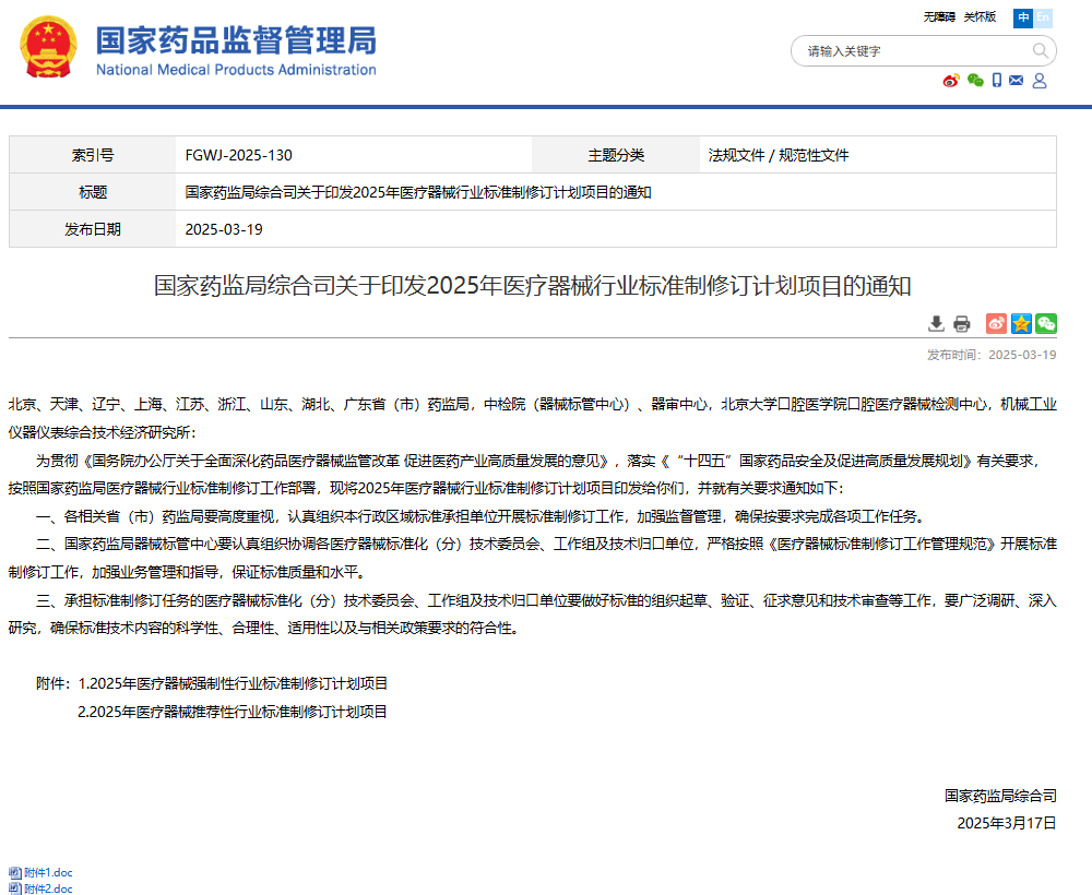 国家药监局综合司关于印发2025年医疗器械行业标准制修订计划项目的通知