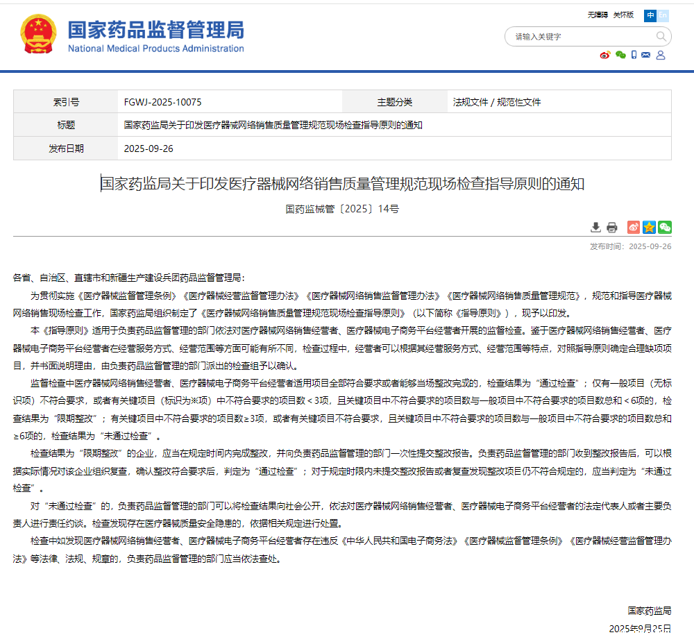 国家药监局关于印发医疗器械网络销售质量管理规范现场检查指导原则的通知