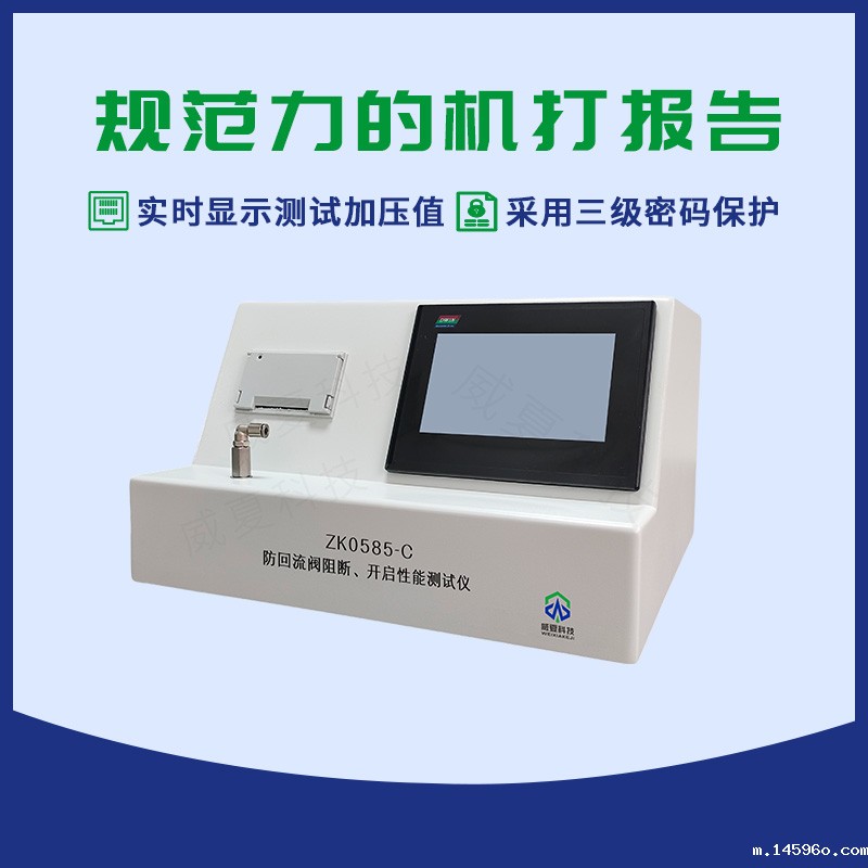 ZK0585-C 防回流阀阻断、开启性能测试仪由可编程控制器,触摸屏、压力传感器、加压装置和机载打印机等组成,提供中英文菜单显示,具备人机对话设定各项参数自动运行测试模式。